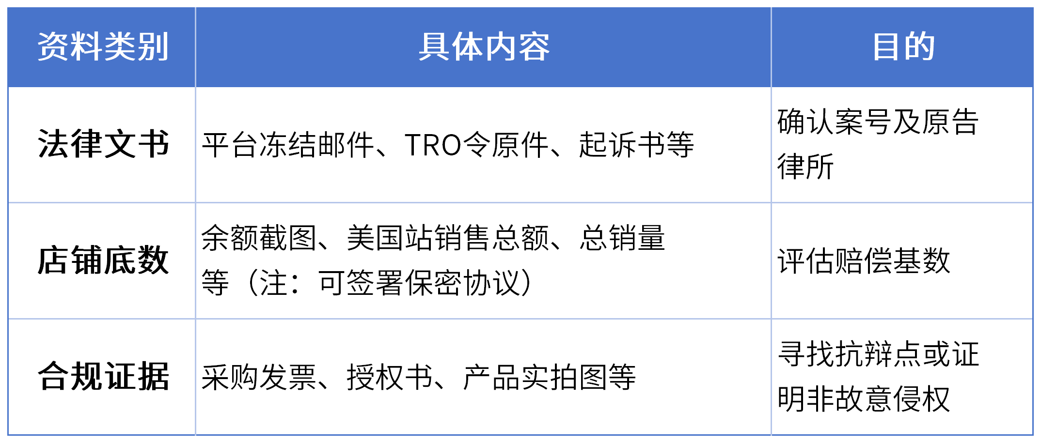 在咨询律师前,请先对照下表备齐资料,以争取最快速度应对: